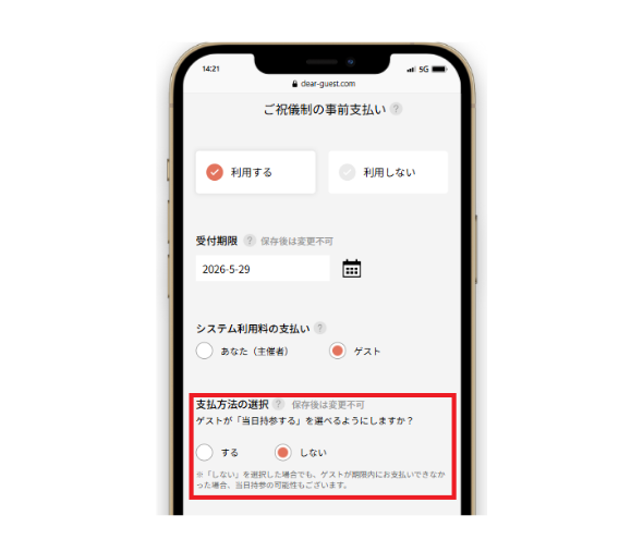 「当日持参」を非表示にするには、「ご祝儀・会費の事前支払い」設定ページ内にある「支払い方法の選択」項目の『ゲストが当日持参を選べるようにしますか?』に対し、『しない』を選択してください。