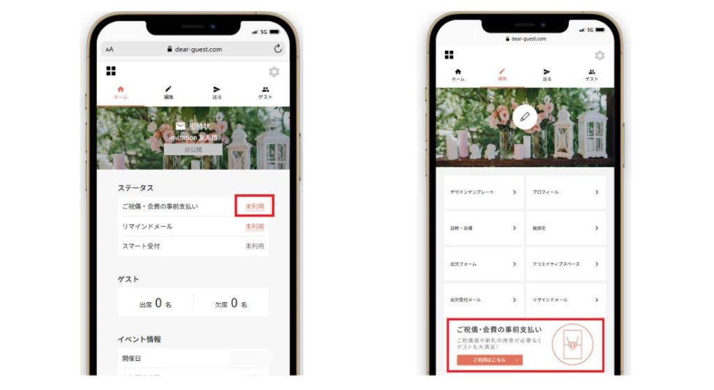 1、招待状「ホーム」の「ご祝儀・会費の事前支払い」の『未利用』をタップ。