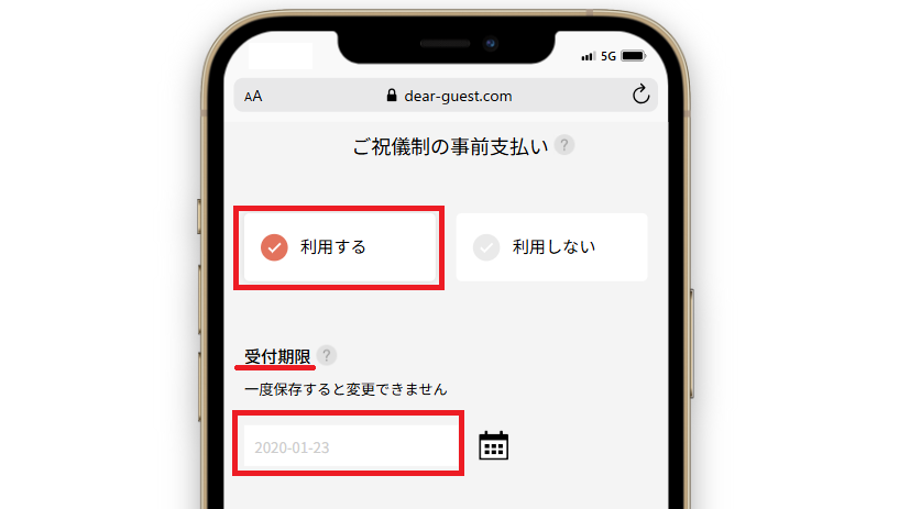 ※ご祝儀や会費を式場への支払いにご利用の場合は、受付期限を式場の支払期限より早めに設定することをおすすめします。