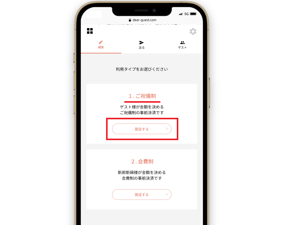 ゲストが金額を決める「ご祝儀制」の「設定する」をタップ。